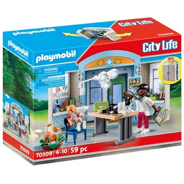 Set includes two figures, dog, cat, rabbit, exam table, chair, and many other accessories. 59 pieces. Recommended for ages four years and up.
