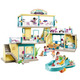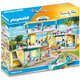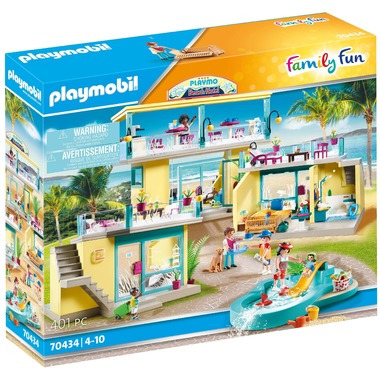 Set includes four adult figures, child figure, baby figure, main hotel building, two hotel rooms with furnishings, lounge chairs, beach bags, luggage, toiletries, dog, toys, and many other accessories to enhance the vacation. 401 pieces.