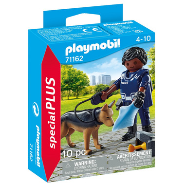 The Special Plus Set includes a PLAYMOBIL figure, a sniffer dog, gloves, leash and other extras. The glove attachments and holster with gun can be removed. The loving toy figures can be played with on their own or combined with other PLAYMOBIL ranges. Recommended for ages 4 and up.