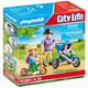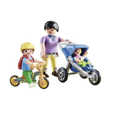 Set includes three figures, stroller, bike, backpack, and other accessories. 17 pieces.