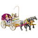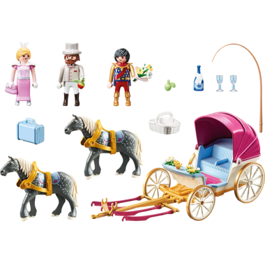 Includes: 1 princess, 1 prince, 1 coachman Animals: 2 horses Accessories: 1 horse-drawn carriage with folding roof and floral decoration, 1 whip, 2 saddlecloths, 2 collars, 4 sluices, 1 drawbar, 1 cylinder with bow, 1 crown, 1 collar, 1 picnic basket, 1 bouquet of flowers with floral paper, 1 clutch, 1 suitcase, 2 apples, 1 bottle of sparkling wine with cloth, 2 champagne glasses.