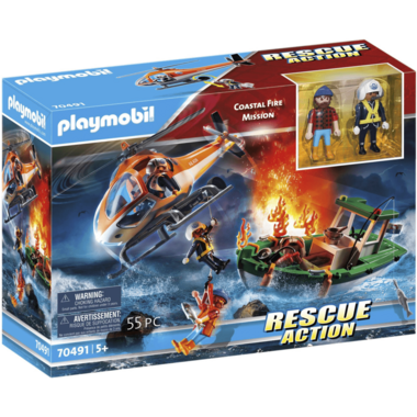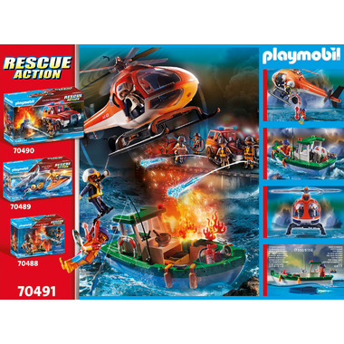 Playmobil Rescue Action Coastal Fire Mission. The firefighters rescue the fisherman from his burning boat in a risky air rescue operation.