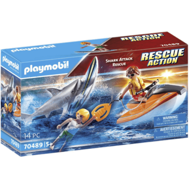 Playmobil Rescue Action Shark Attack Rescue. The lifeguard uses his personal watercraft to rescue the surfer from a shark attack.