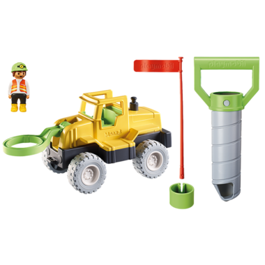 Figures: 1 Construction worker Accessories: 1 drilling vehicle with sand drill, 1 basket with flag