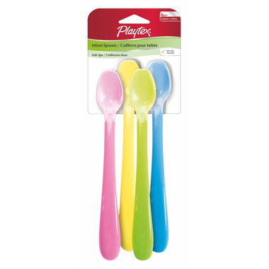 Playtex Mealtime infant spoons were designed with flat and flexible tips to better clean off babies’ faces as they eat, and spoon bowls deep enough to hold food, but shallow enough for the baby to eat the entire spoonful. Both babies and moms will find the design more comfortable – the soft spoon tips are gentle on babies’ gums and the ergonomically designed handles give moms’ wrists a rest. Additionally, the long, angled handle makes scooping food out of deep jars and bowls easy.
