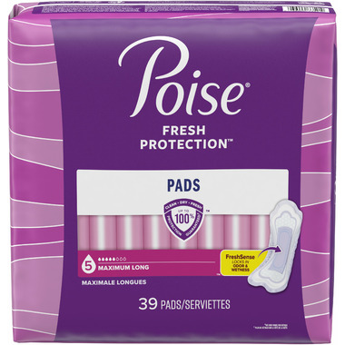 Enjoy up to 100% clean, dry and fresh protection guaranteed* with Poise Postpartum and Incontinence Pads. Unlike period pads, which are meant for menstrual needs, Poise pads are designed to offer protection against light bladder leaks. These disposable incontinence pads lock in wetness and are made with Poise’s FreshSense system that neutralizes strong bladder leak odors for up to 12 hours for all-day freshness. In fact, Poise bladder control pads are 10x drier than the leading period pad, offer up to zero leaks and deliver up to 12 hours of protection. Each bladder leak pad features a ContourFit design, making it softly curved to help prevent bunching and has a wider front and back than in the middle to keep you comfortably protected. Poise Postpartum Pads and Incontinence Pads are available in light, moderate, maximum, ultimate, ultra and overnight absorbencies. For lighter absorbency needs, check out Poise Daily Liners.