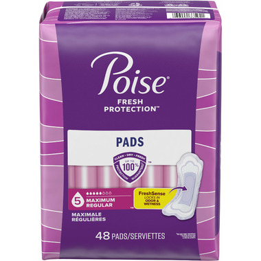 Enjoy up to 100% clean, dry and fresh protection guaranteed* with Poise Postpartum and Incontinence Pads. Unlike period pads, which are meant for menstrual needs, Poise pads are designed to offer protection against light bladder leaks. These disposable incontinence pads lock in wetness and are made with Poise’s FreshSense system that neutralizes strong bladder leak odors for up to 12 hours for all-day freshness. In fact, Poise bladder control pads are 10x drier than the leading period pad, offer up to zero leaks and deliver up to 12 hours of protection. Each bladder leak pad features a ContourFit design, making it softly curved to help prevent bunching and has a wider front and back than in the middle to keep you comfortably protected. Poise Postpartum Pads and Incontinence Pads are available in light, moderate, maximum, ultimate, ultra and overnight absorbencies. For lighter absorbency needs, check out Poise Daily Liners.
