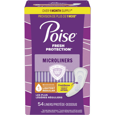 Enjoy up to 100% clean, dry and fresh protection guaranteed* with Poise Daily Microliners Postpartum and Incontinence Panty Liners. Unlike period liners, which are meant for menstrual needs, Poise liners are designed to offer protection against light bladder leaks. Each bladder leak panty liner is made with Poises FreshSense system that neutralizes even strong bladder leak odors for up to 12 hours and feature a DryTouch layer to help keep you fresh and dry all day long. They're ultra-absorbent and deliver up to zero leaks. In fact, Poise pantiliners are 10x drier than the leading period liner and have a CaptureCore that wicks away wetness in seconds for better bladder leak protection than the leading period liner. Plus, these disposable liners are incredibly thin and deliver flexible protection. For heavier absorbency needs, try Poise Incontinence Pads.