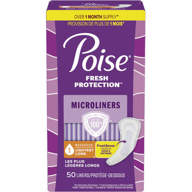 Enjoy up to 100% clean, dry and fresh protection guaranteed* with Poise Daily Microliners Postpartum and Incontinence Panty Liners. Unlike period liners, which are meant for menstrual needs, Poise liners are designed to offer protection against light bladder leaks. Each bladder leak panty liner is made with Poises FreshSense system that neutralizes even strong bladder leak odors for up to 12 hours and feature a DryTouch layer to help keep you fresh and dry all day long. They're ultra-absorbent and deliver up to zero leaks. In fact, Poise pantiliners are 10x drier than the leading period liner and have a CaptureCore that wicks away wetness in seconds for better bladder leak protection than the leading period liner. Plus, these disposable liners are incredibly thin and deliver flexible protection. For heavier absorbency needs, try Poise Incontinence Pads.