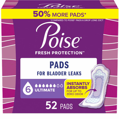 - POISE INCONTINENCE PADS: 52 incontinence and postpartum bladder leak pads, 6 drop ultimate absorbency, regular length (56 pads total)