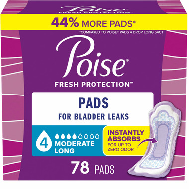 • POISE INCONTINENCE PADS: 78 incontinence and postpartum bladder leak pads, 4 drop moderate absorbency, long length (84 pads total)