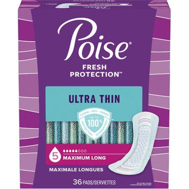 Say goodbye to discomfort from bladder leaks and hello to Poise Ultra Thin Pads, our thinnest incontinence pad, designed for your comfort and protection. Poise incontinence pads for women are made specifically for bladder leaks unlike period pads, which are meant for menstrual needs. In fact, Poise pads keep you 10x drier compared to the leading period pad. They absorb bladder leaks, lock away wetness, neutralize odors and are made with breathable materials that help eliminate dampness, so you feel clean and fresh too! Poise bladder control pads are discreet and fit securely in your underwear. Poise incontinence pads are available in light, moderate, maximum, and ultimate absorbencies. For lighter absorbency needs, check out Poise Daily Liners.