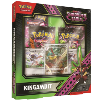 You'll also find four booster packs from the special Scarlet & Violet Shrouded Fable expansion. The Pokemon TCG: Scarlet & Violet Shrouded Fable Kingambit Illustration Collection includes: 1 full-art foil promo card featuring Kingambit, 2 foil cards featuring Pawniard and Bisharp, 4 Pokemon TCG: Scarlet & Violet Shrouded Fable booster packs and A code card for Pokemon TCG Live.