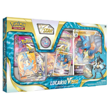 Includes: 1 etched promo card featuring Lucario V, 1 etched promo card featuring Lucario VSTAR, 1 etched oversize card featuring Lucario VSTAR, 1 colorful collectors pin featuring Lucario, 1 metallic coin featuring Lucario, 1 acrylic VSTAR marker, 6 Pokmon TCG booster packs and a code card for Pokmon Trading Card Game Live