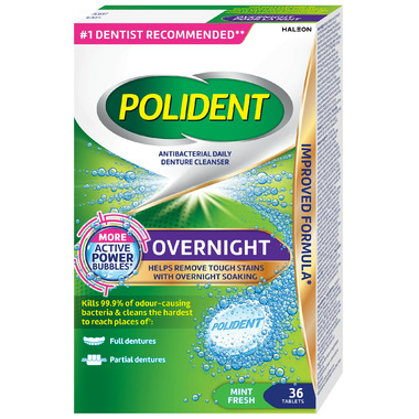 Polident Overnight tablets kill 99.9% of odour-causing bacteria, remove stubborn stains and help reduce plaque build up leaving your dentures cleaner, fresher and brighter every day.