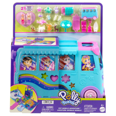 - The Polly Pocket Pet Mobile Adventure playset is full of outdoor fun with 2 micro dolls and 21 accessories including pets and a smaller van vehicle. The pet-themed van features working wheels with a sticker sheet for decorating and opens to the ultimate outdoor adventure with animals and friends!