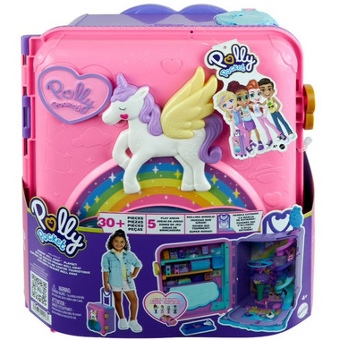 - This Polly Pocket Pollyville Resort Roll Away doubles as a playset and storage unit for Polly compacts.