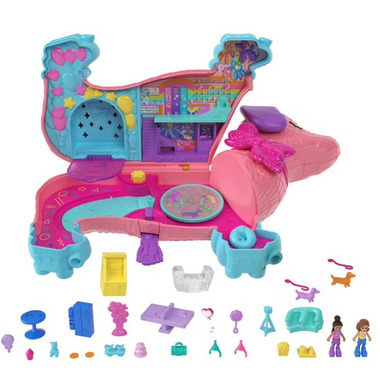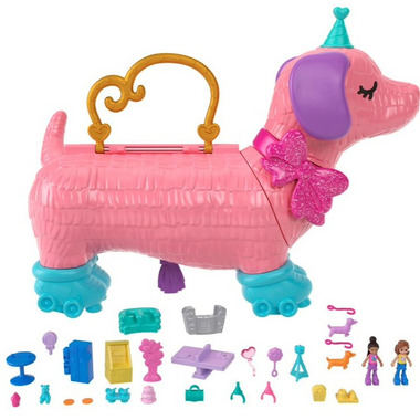 • This Polly Pocket Puppy Party Playset features a puppy piata exterior and opens to a skate rink birthday party that includes 2 dolls and 26 paw-some accessories!