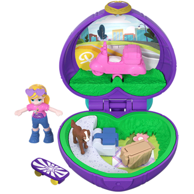 Includes micro Polly™ doll, a picnic basket, skateboard and Polly's dog, Peaches.