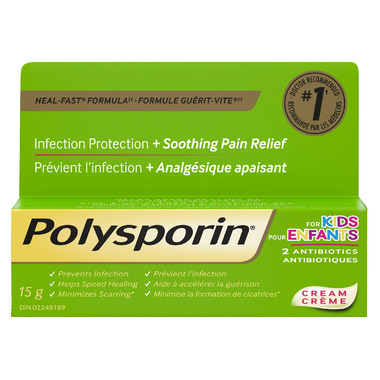 Polysporin For Kids Cream, 15g with Heal-Fast Formula provides soothing infection protection that helps speed the healing of minor cuts, scrapes and burns. This non-greasy cream contains two antibiotics to help prevent infection, and Lidocaine Hydrochloride for soothing pain relief. This non-staining, odourless and non-greasy cream absorbs quickly. This cream comes in 15-gram and 30-gram tubes. From Polysporin, the number 1 doctor recommended anti-infective brand*. *Based on 2019 survey data published in Medical Post