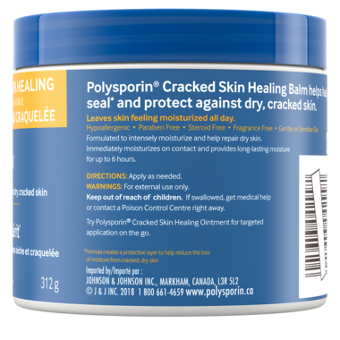Polysporin Cracked Skin Healing Balm is proven to help heal, seal and protect against stubborn dry, cracked skin by creating a protective layer to help reduce the loss of moisture. Be it cracked heels, fingertips or hands, this healing balm will immediately moisturize skin for up to 6 hours. The formula is hypoallergenic, paraben free, steroid free, unscented and gentle on sensitive skin. Try this effective healing balm moisturizer today.