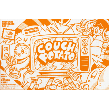 Couch Potato Potato Chip 33.6% Milk Chocolate Bar: 33.6% Milk Chocolate (Sugar, Cocoa Butter, Whole Milk Powder, Cocoa Mass, Soy Lecithin (An Emulsifier), Natural Vanilla Flavour), Potato Chips (Potatoes, Vegetable Oil, Salt).