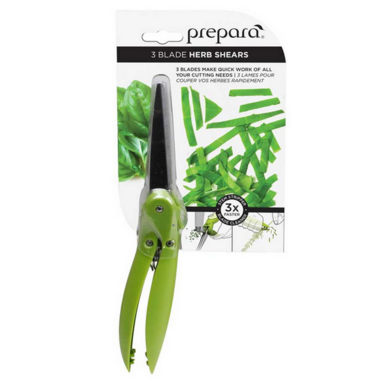 Prepara 3-Blade Herb Shears is the perfect tool for quickly adding fresh flavor to any dish. A few quick squeezes of the spring loaded handles will cut and shred herbs quickly and easily. Locks for safe, compact storage.  Includes an integrated stem stripper built into handles and a blade cover that doubles as a blade cleaner.