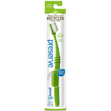Preserve consulted closely with dental professionals to create a toothbrush that gets your teeth cleaner but minimizes your impact on the environment. The design includes a curved handle for those hard-to-reach places and a three-level bristle arrangement to massage your gums. And while the bristles are brand new, the handle is made from recycled #5 plastics (which include things like yogurt cups.) Preserve toothbrushes are recyclable through Preserve's mail-in recycling program.