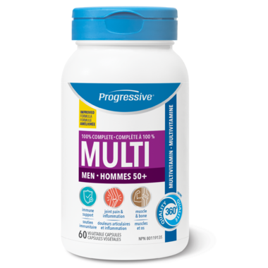 Getting older is no reason to slow down. Progressive 100% Complete MultiVitamin for Men 50+ addresses the needs of an aging body to help you feel your best. This improved formula features a complex of supporting nutrients designed to address Mens health needs as you age. These include Saw Palmetto, Fenugreek, Maca, Turmeric, Bacopa Extract and CoQ10.