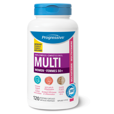 Getting older is no reason to slow down. Progressive 100% Complete MultiVitamin for Women 50+ addresses the needs of an aging body to help you feel your best. This improved formula features a complex of supporting nutrients designed to address Womens health needs as you age and help relieve symptoms associated with menopause, such as hot flashes. These supporting herbal nutrients include Black Cohosh, Chastetree, Maca, Turmeric, Bacopa Extract, and CoQ10.
