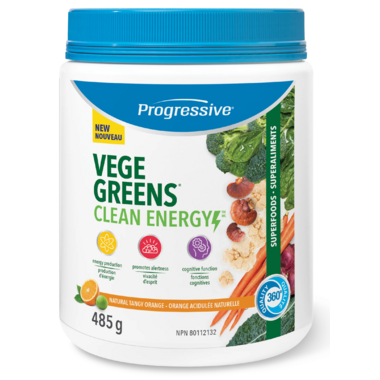 Progressive VegeGreens Clean Energy is a convenient way to supplement your diet with functional and energizing superfoods. Each scoop of this vegan superfood powder provides you with real food ingredients sourced from land and sea vegetables. The added Clean Energy Blend includes B vitamins, L-Theanine, natural caffeine from Green Coffee Beans, and Bacopa to give you a noticeable energy boost without the jitters. VegeGreens Clean Energy also provides support for your immune and digestive systems, while also supporting your bodys anti-inflammatory response. This naturally energizing formula features an enzyme blend to help your body better digest the plant-based ingredients. Each scoop also provides you with an adaptogen mushroom blend and functional botanical ingredients such as Turmeric, Tart Cherry and Elderberry.