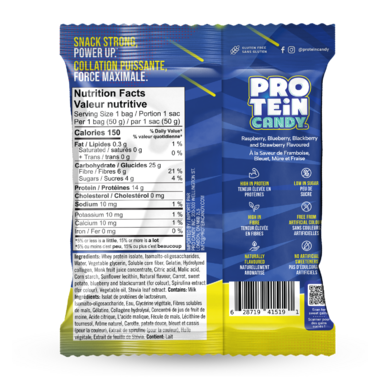 The pucker you love with the protein you need. These classic chewy candies come in Sour Cherry, Strawberry, Orange, and Lemon flavours. With low sugar and high protein, you can satisfy your sweet tooth without the guilt. Perfect for snacking on the go!