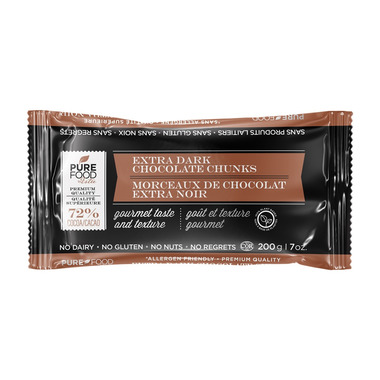Pure Food by Estee Premium Quality Extra Dark Chocolate Chunks made with 72% cocoa. Best ingredients for best results.