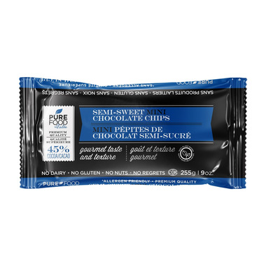 Pure Food by Estee Premium Quality Semi-Sweet Mini Chocolate Chips made with 45% cocoa. Best ingredients for best results.