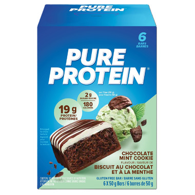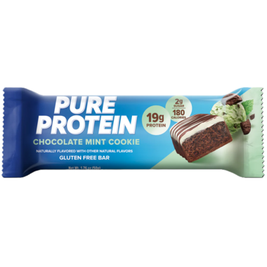 Pure Protein Chocolate Mint Cookie Protein Bars are delicious high protein snacks that support lean muscle and strength. Each chocolate mint cookie protein bar contains 19 grams of protein, 180 calories and 2 grams of sugar, for a great tasting and gluten free protein snack. Additionally, these high protein bars support your active lifestyle so toss them in your gym bag for a protein snack you can eat pre workout, post workout or on the go during a busy day. With tasty chocolate mint cookie flavor, it's easy to enjoy a Pure Protein bar any time of day. Pure Protein is proud to offer low sugar(1) protein bars with great taste. (1) Pure Protein products contain 5g sugar or less.