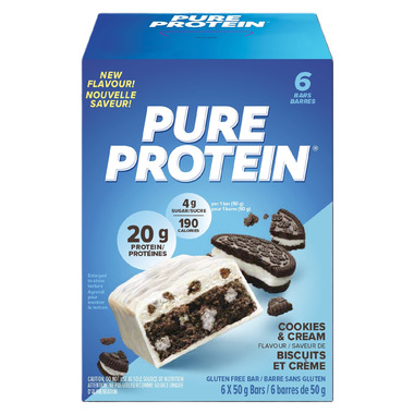 Pure Protein Cookies and Cream bars are a unique twist on a classic flavor combination. Enrobed with delicious white chocolate flavoured cream with yummy crunchy chocolate cookie bits you wont believe it has just 4g of sugar and 20g Protein!