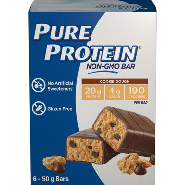 Looking for a protein bar that is delicious with no artificial sweeteners? Try the Pure Protein Non-GMO cookie dough protein bars! With 20g of protein, only 4g of sugar And 190 calories, these gluten free bars are perfect for whenever hunger strikes.