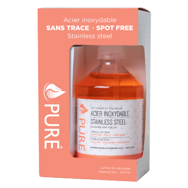 Pure's stainless steel cleaner is made from a concentrated cleaning and polishing formula based on vegetable oil that gives a shine to stainless steel and metal surfaces. Naturally effective, a few drops are enough. This product protects your surfaces against finger and grease stains for easy maintenance.
