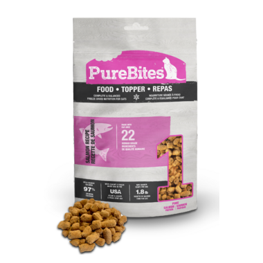 PureBites® Salmon Recipe RAW Freeze Dried Complete & Balanced cat food or topper is made with 22 Human Grade Ingredients. Made with 97% Human Grade Wild Caught Salmon & 3% Human Grade Essential Vitamins, Minerals & Natural Preservatives. PureBites® Salmon Recipe can be fed as a 100% complete & balanced cat food or as a mixer / topper for an added RAW protein boost. With on average only 2 calories per morsel, PureBites® Freeze Dried Complete & Balanced Food or Topper is made with human grade Wild-Caught Salmon sourced and gently freeze dried in the USA.