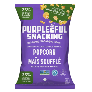 Purplesful Snacking Purple Kernel Jalapeno Popcorn is made from ancient grain, Non-GMO Verified, purple kernel corn. It’s lighter, fluffier, and healthier for you because unlike yellow popcorn, this purple kernel corn is naturally rich in antioxidants. Purplesful Snacking is a Canadian, female founded and owned healthy snack food company that proudly donates 25% of profits to local children’s charities. Snack with purpose.