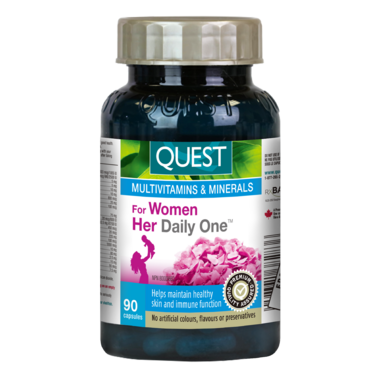 Quest® Her Daily One™ for Mature Women 50+ is a high-quality, well-balanced, one-a-day multivitamin and mineral supplement designed specifically to meet the life-stage and gender needs of women over 50. Formulated as a capsule, this supplement is easily absorbed and easy to swallow, and it provides all the nutrients required for healthy skin, bones, and teeth and the maintenance of good health.
