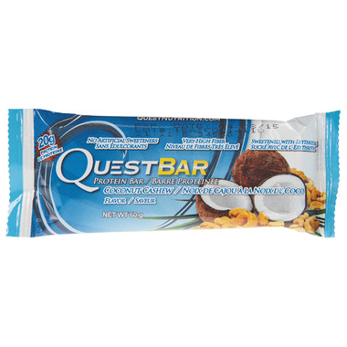 The All Natural Quest Protein Bar in a delicious blend of Coconut and Cashew! It is a high fiber, gluten free and high protein bar, perfect for your afternoon pick-me-up or right before a workout! Quest is the only true low carb bar in the market and is still satisfyingly tasty and guilt free!
