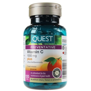 Ingredients: Each easy-to-swallow, timed-release tablet of Quest Vitamin C 1000 mg Timed-Release contains 1,000 mg of vitamin C (ascorbic acid) and 100 mg of citrus bioflavonoids.