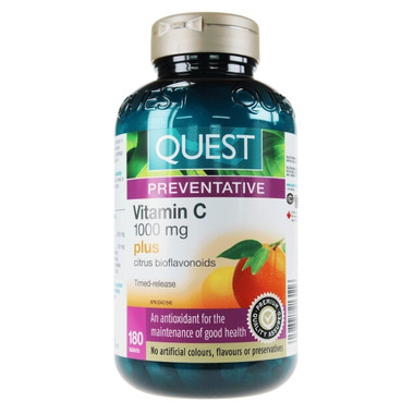 Each easy-to-swallow, timed-release tablet of Quest Vitamin C 1000 mg Timed-Release contains 1,000 mg of vitamin C (ascorbic acid) and 100 mg of citrus bioflavonoids. This product contains no artificial preservatives, colours, or flavours, dairy, egg, shellfish, soy, sulfites, wheat, gluten, or animal derivatives.