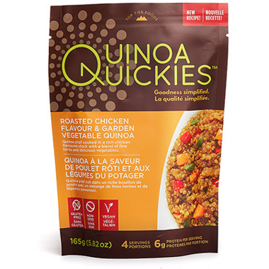 Quinoa Quickies Roasted Chicken flavour and Garden Vegetables - goodness simplified. Quinoa pilaf cooked in a rich chicken flavoured stock with a blend of fine herbs and delicious vegetables.