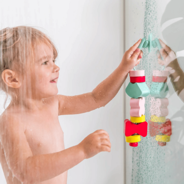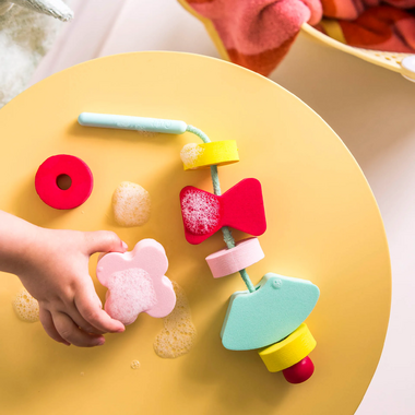 Your kids very first lacing beads! Quut Beadi are brightly coloured lacing beads made of soft EVA foam, perfect for smaller hands due to their larger shape. They stimulate cognitive ability and enhance hand-eye coordination. Use the suction cup to hang your kid's creation on your bathroom wall, adding a kid-friendly touch to the room. With different shapes and colours, there are endless variations. The shapes float on water and stick to walls, promoting hand-eye coordination, creative play, visual perception, and fine motor skills. Made of silicone and EVA foam, they are easy to dry, store, and free from BPA, phthalates, and latex.