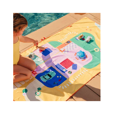 Double the fun with our play towels. This play towel features a unique design and two sides. On the front, there’s a game, and on the back, you’ll find a graphic pattern. A smart 2-in-1 concept! Lightweight microfiber towels featuring an interactive game on the front and a stylish print on the back.