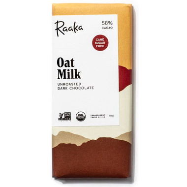 Raaka Oat Milk Unroasted Dark Chocolate contains 58% cacao and is free from cane sugar. Raaka is Non-GMO Project Verified, USDA Organic certified, and is transparently traded.
