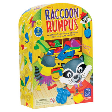Join the party! Raccoons have raided your closet and now they’re having a party, with Raccoon Rumpus. Help these masked bandits get dressed—the critter that collects the most costumes wins. Includes 4 raccoon cards, 20 costume cards, 1 jumbo color die, 1 jumbo costume die, and game guide. 2-4 players.