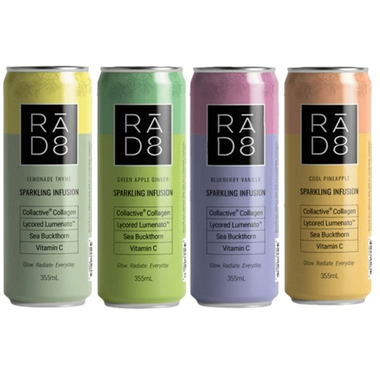 RA.D8 Blueberry Vanilla Sparkling TeaBrewed tea (filtered water, black tea concentrate), Marine collagen complex, Cane sugar, Natural flavours, Sea Buckthorn Extract, Lumenato blend (RO water, modified coconut oil, tomato oil extract, sunflower lecithin), Vitamin C (ascorbic acid), Citric Acid, Tartaric Acid.